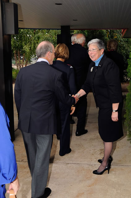 Penn College President Davie Jane Gilmour welcomes guests outside Le Jeune Chef Restaurant.