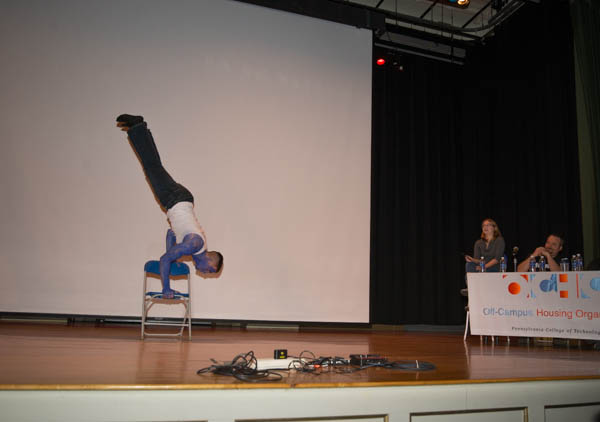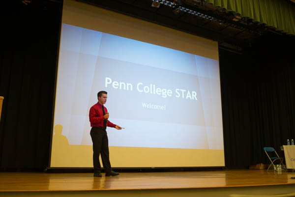 Buoyed by a strong audience following – and a final act that incorporated the college mascot – a welding and fabrication engineering technology major rose from a fourth-place finish in the first round of "Penn College Star" to win the $500 top prize among six talented competitors at this week's finals. George W. Settle III, of Dillsburg, whose dramatic "pec dance" finished fourth in Round One and advanced as a "Wild Card" entry in Round Two, was crowned the champion after Wednesday's finale in the Klump Academic Center Auditorium. "It was the most amazing show ever," said Ashley A. Smith Nicholas, coordinator of residence life, whose sentiments were shared by co-sponsors Katie L. Mackey, coordinator of off-campus living and commuter services, and Kas A. Williams, residence life coordinator. "We have quite the talented artists here at Penn College. Great singers, songwriters and dancers." Julia I. Gilchrist, a plastics and polymer engineering technology major from Hanover, finished second for her ukulele, guitar and vocals; third place was won by guitarist/singer Darren J. Layre, of Hatboro, enrolled in culinary arts and systems. Other finalists were Chad M. Austin, a heavy construction equipment technology: technician emphasis major from Eldred, guitar and vocals; Kimberly S. Filko, a graphic design student from State College, clog dancing; and Benjamin J. Leskovansky, of Bellefonte, enrolled in information technology sciences – gaming and simulation, guitar and vocals. "All of the artists were amazing and deserve recognition," Nicholas said. "'Penn College Star' proves how talented our students really are. It was exciting to see them develop and enhance their talents over the last semester."