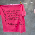 The Clothesline Project, a way for women affected by violence to express their emotions, has returned to Madigan Library through Thursday. T-shirts bearing testimony to the enduring problem, designed by survivors and their supporters, are pinned to the clothesline in hopes that their hanging will lead to healing.Photos by Caleb G. Schirmer, student photographer