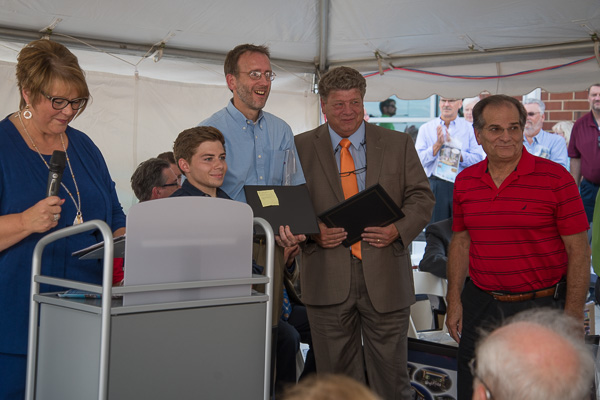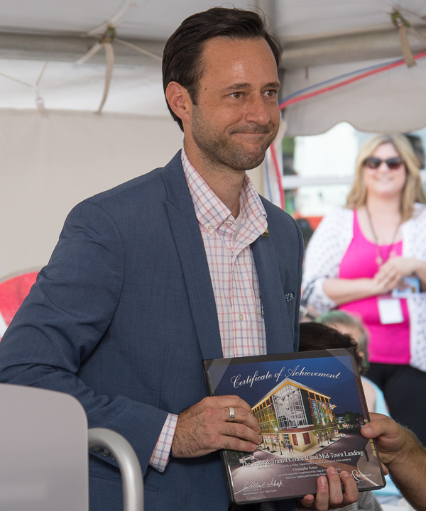 Keiser, an LDG project manager whose impressive resume includes a Penn College degree, accepts accolades for his design of the River Portal sculpture.