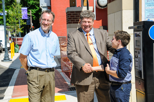 Mulroy (right) is congratulated by Rob A. Wozniak (left), associate professor of architectural technology, and Marc E. Bridgens, dean of construction and design technologies ...