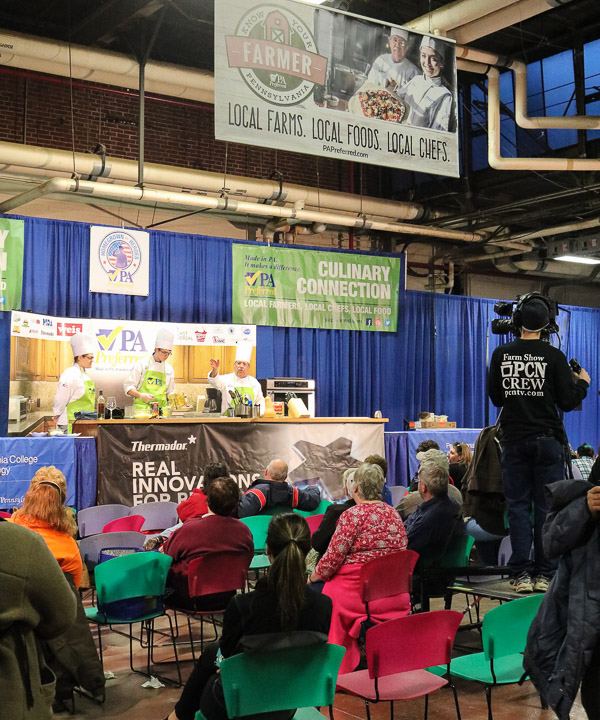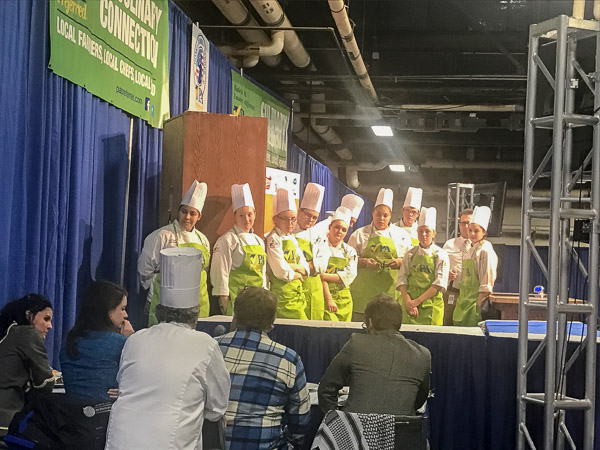 Students in Penn College’s hospitality majors join their instructor, Chef Michael J. Ditchfield, on the Culinary Connection stage at the Pennsylvania Farm Show last January.