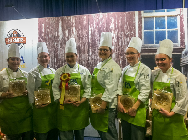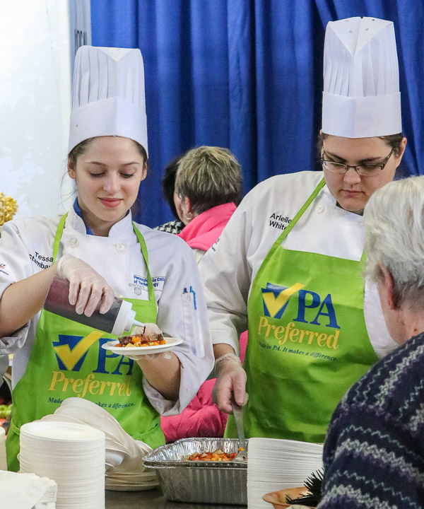 On the evening before the Farm Show’s opening, they assisted with a reception by the Pennsylvania Department of Agriculture to celebrate such initiatives as PA Preferred, a public-private partnership to promote Pennsylvania’s high-quality agricultural products; Know Your Farmer; and LEAF, a project in Leadership Education and Farming for Pennsylvania youth. The students helped to prepare foods for the reception, which was attended by the governor and other VIPs, and worked with chefs and farmers at each food station.