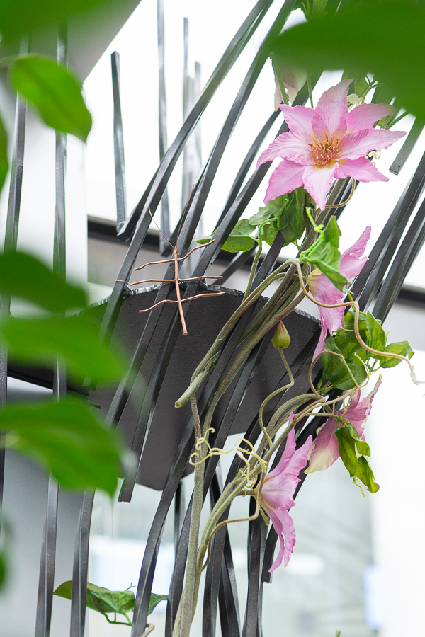 Andrea L. Mull, horticulturist/grounds and motorpool supervisor, crafted five ornamental spheres that hang into the space. She and Chad L. Karstetter, horticulturist/motorpool lead person, produced large floor planters and two bench seats that resemble mountain stone. Metalwork fabricated by Chad M. Aloisio, service and design technician, adds visual interest to the glass garden teeming with living plants and accents of faux foliage and decorative curiosities, including metal bugs, ladybugs and an owl.