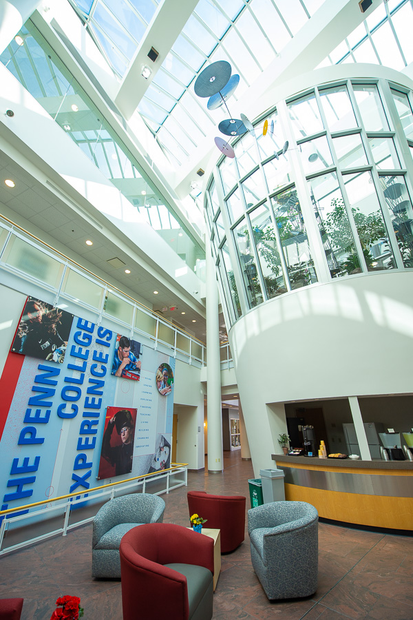 Named in honor of Veronica M. Muzic, the first recipient of Penn College’s Master Teacher Award, the terrarium has been installed in the former “Core” on the second floor of the building and is visible from all three floors. Visitors are also welcome to enter the terrarium and meander along a small curved walkway to take in the greenery or sit awhile on one of two benches.