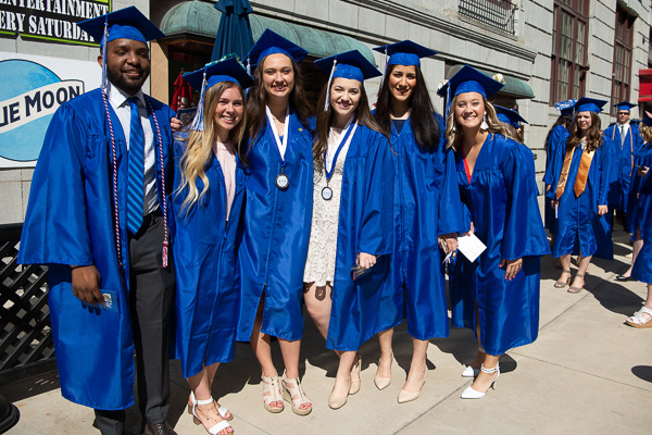 Lined up for a rewarding walk along West Fourth Street are (from left) Jacob R. Miller, associate professor of computer science, tasked with introducing the program's grads from the Arts Center stage; applied technology studies student Edward C. Zawislak III; and information assurance and cyber security majors Henri Gabriel Alexandre Jr., Matthew Philip Bikle and Breanna M. Fieger.