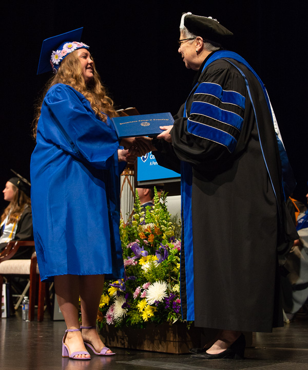Sporting a grad cap bedecked with floral accents, dental hygiene graduate MaeKayla L. Brown complements the display at the podium.