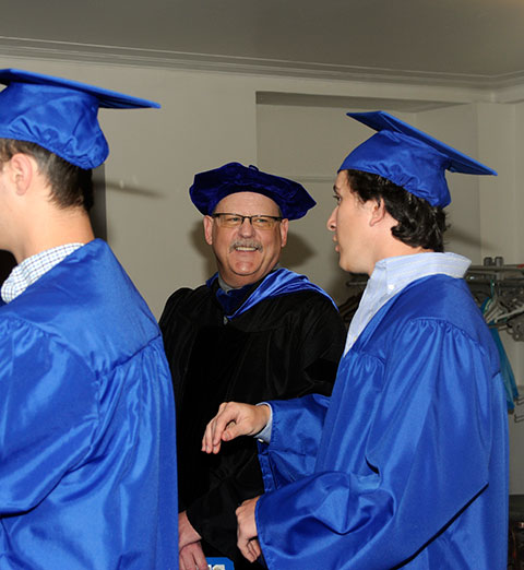 Andrew Bartholomay (center), assistant professor of forestry, talks with seniors prior to their procession from the Genetti Hotel ballroom.