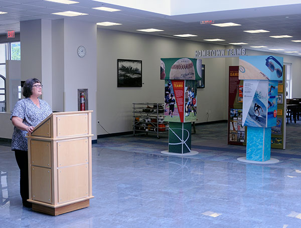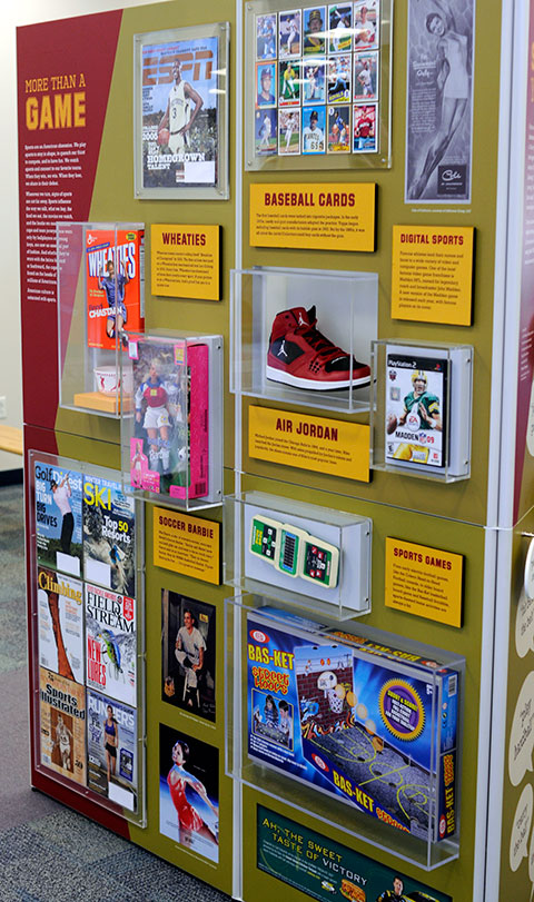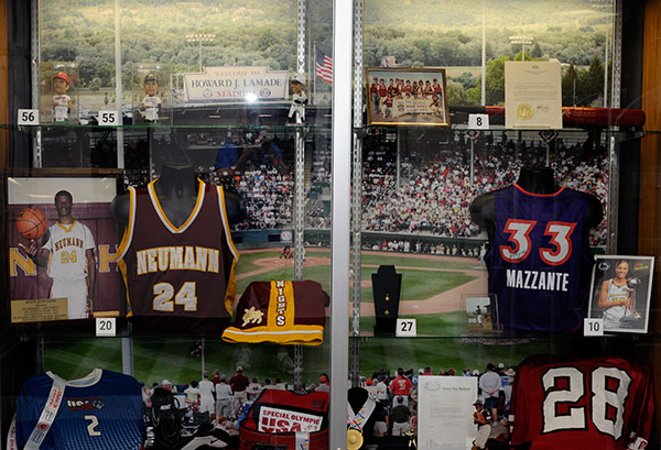 An entryway display case amplifies the "hometown" message through memorabilia that honors a sampling of local sports figures: baseball's Mike Mussina and Tom O'Malley, basketball's Alize Johnson and Kelly Mazzante, football's Gary Brown, and Special Olympics athletes.