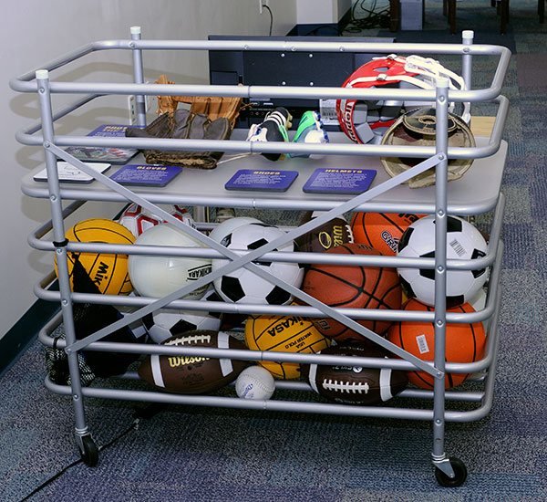 A container filled with equipment covers many of the sports represented on the display floor ...