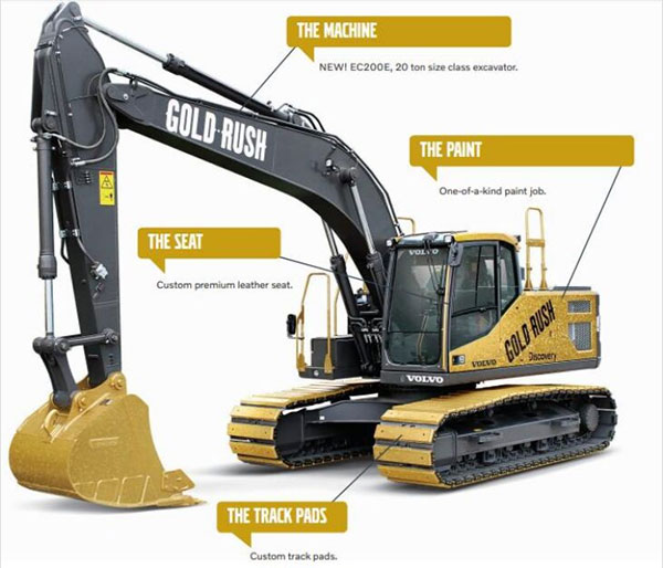 The Gold Rush Excavator celebrates the 10th anniversary of the Discovery show, "Gold Rush," and is on tour in the United States and Canada, featuring the new Volvo CE EC200E 20-ton model with an Akzo Nobel paint job valued at $5,000 to $7,000; one-of-a-kind, custom premium leather KAB seating with the embroidered signatures of co-stars Tony Beets, Parker Schnabel and Rick Ness; and gold custom track pads.