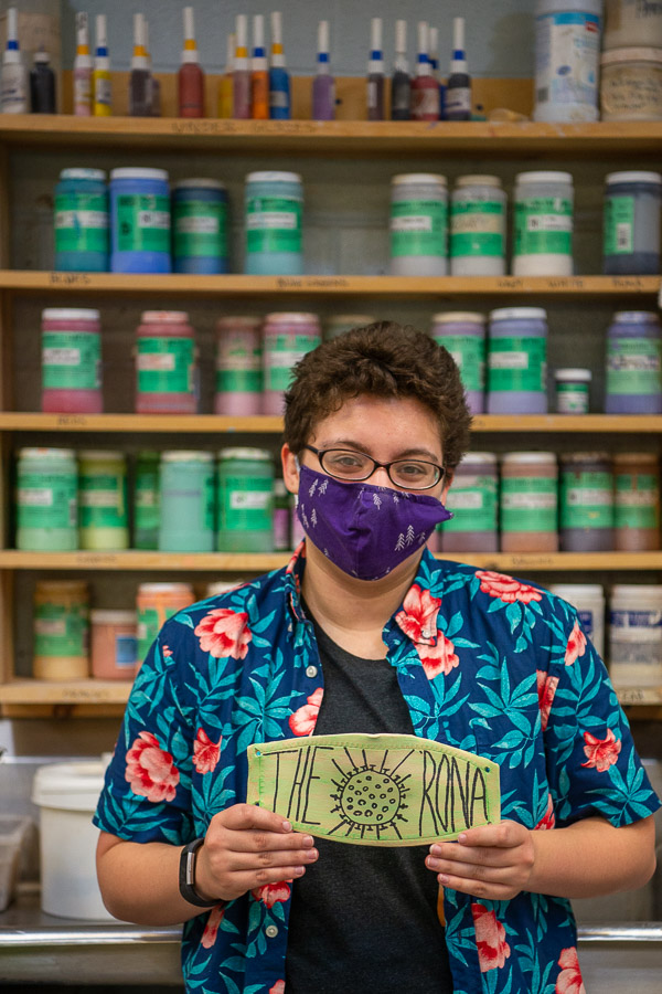 In the ceramics lab, Bri Milden, information technology: network specialist concentration, poses with “The Rona” mask.