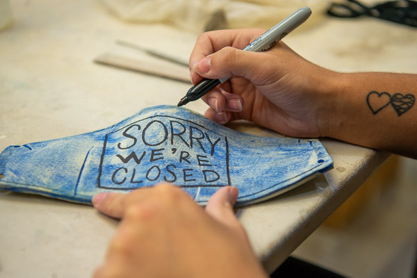 Kevin C. Osczepinski completes his mask, giving a shoutout to essential personnel. The graphic design student was employed by FedEx this summer and is the son of teachers.
