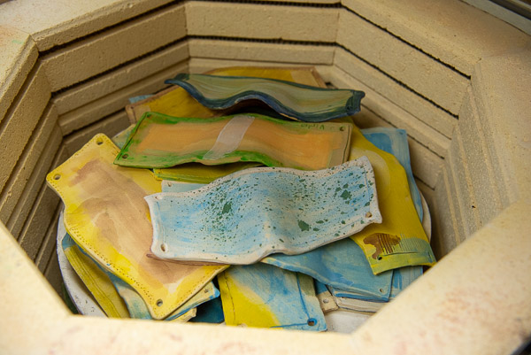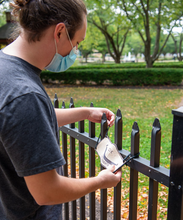 Each student in the Ceramics 1 classes made two clay masks and could decorate them both or share a mask with a friend to embellish. Once completed, yarn pieces were tied onto the masks to resemble ear straps that handily doubled as hangars for the art installation on the campus fence.