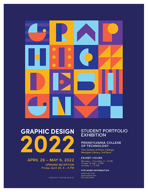The talents of 11 graphic design seniors at Pennsylvania College of Technology will be in the spotlight with “Graphic Design 2022,” the annual student portfolio exhibition in The Gallery at Penn College, April 26 through May 6.