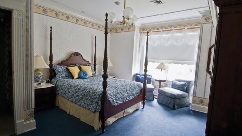 Highlights include a wraparound porch, a grand foyer with an inviting oak staircase, a first-floor parlor with a fireplace, and a second-floor rotunda featuring a sitting room/library. Four bedrooms are decorated with Victorian reproduction furniture and accents.