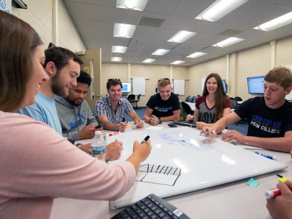 Students collaborate in Penn College’s Woodlands Bank Innovation Lab, applying technology and creative problem‑solving to real‑world business challenges.