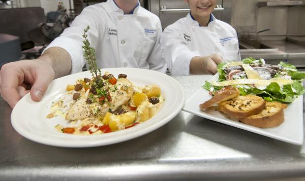 Dress Code: Professionalism is the signature of this degree, and is the expectation for performance and appearance. Uniform and personal appearance standards are strictly enforced. Students are required to be clean-shaven (neat mustache above the lip is allowed), have properly contained hair (top of ear and back of collar for men; tied up and under hat for women, utilizing a net if necessary - no protruding bangs). In labs, no excessive makeup and no jewelry are allowed, including rings, watches and earrings or visible piercings of any style. Students in Table Service and/or Wine and Beverage Practicums may wear appropriate cosmetics, a watch, a single set of post-style earrings. Hair must be restrained - the utilization of a French braid or discrete pinning/styling is required.