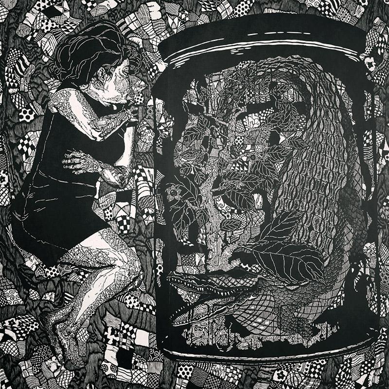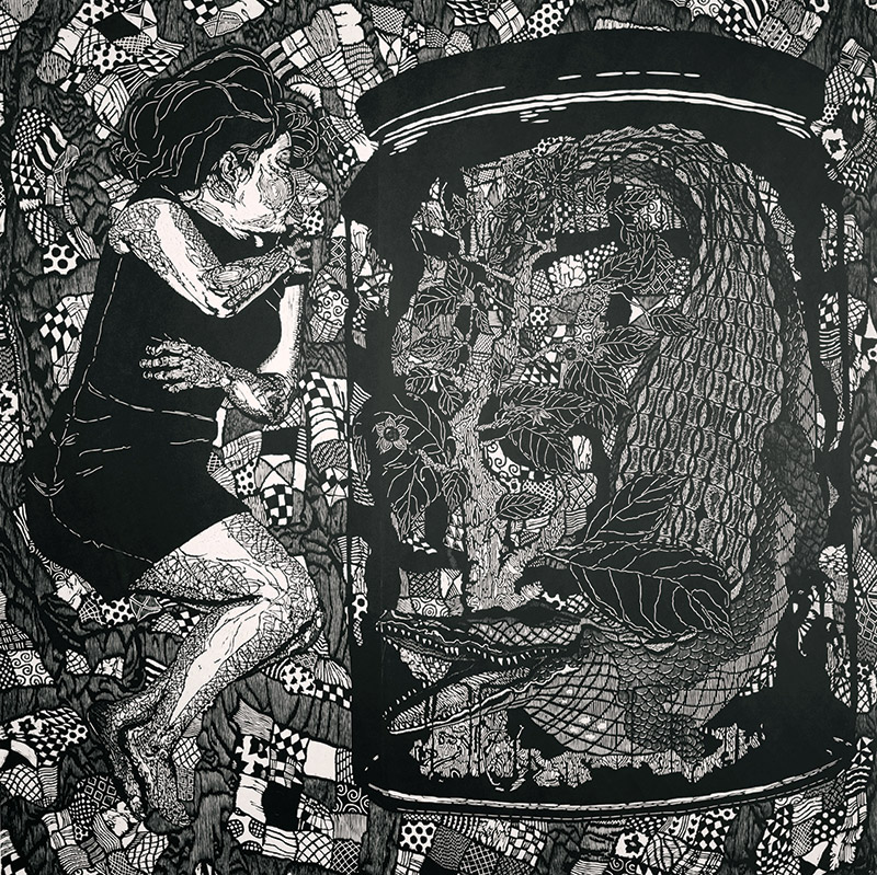 For centuries the graphic traditions of woodcarving and printmaking have used darkness to articulate the split between seen and unseen, reality and myth, waking and dreaming. Fairy tales dramatize and give shape to what is hidden and lives in shadow. A collage of fantasy and reality intersperse in these stories, and the works of Patrick Vincent and Lauren Kinney celebrate this density, complexity, and wonder through large woodcuts, prints, and handmade books. Patrick Vincent engages the physicality of the print, paper, and book to survey the interconnection of animal and human in folk tales and fairy tales. Lauren Kinney uses hidden pictures, symbols, and patterns to weave collected imagery into narrative.