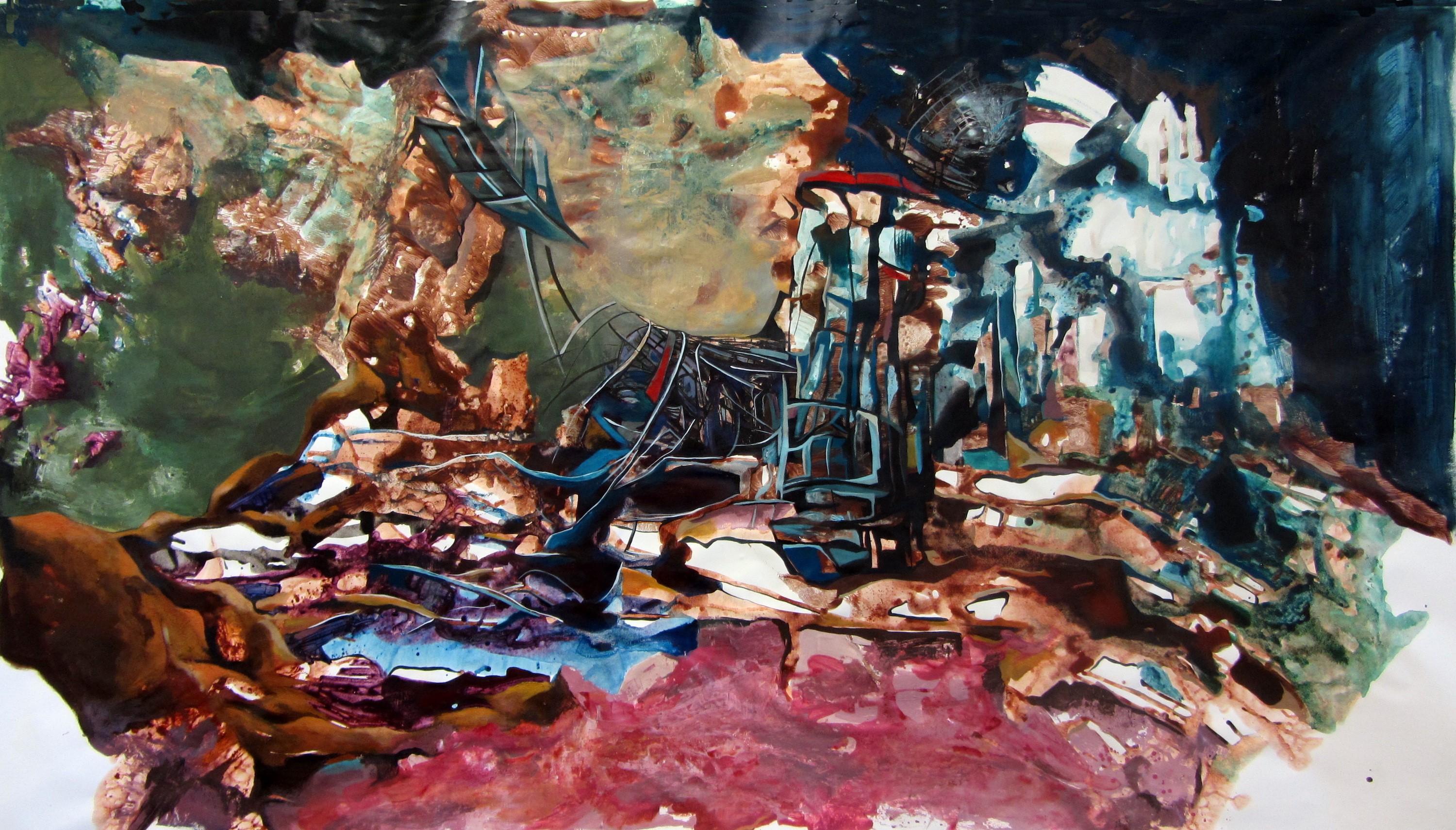 Spatial ambiguity over the course of cultural change is the explored theme of Zahra Nazari’s paintings and installations. Structures both ancient and contemporary are merged into abstract, organic forms with floating, collapsing, and shifting environments. This unification is represented with both laws and chaos to convey the unsettled sensations caused by the transitions between different cultures.