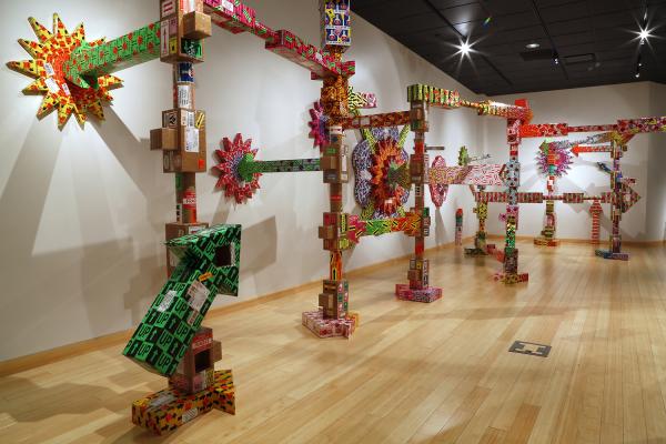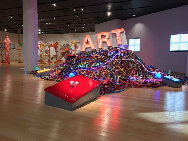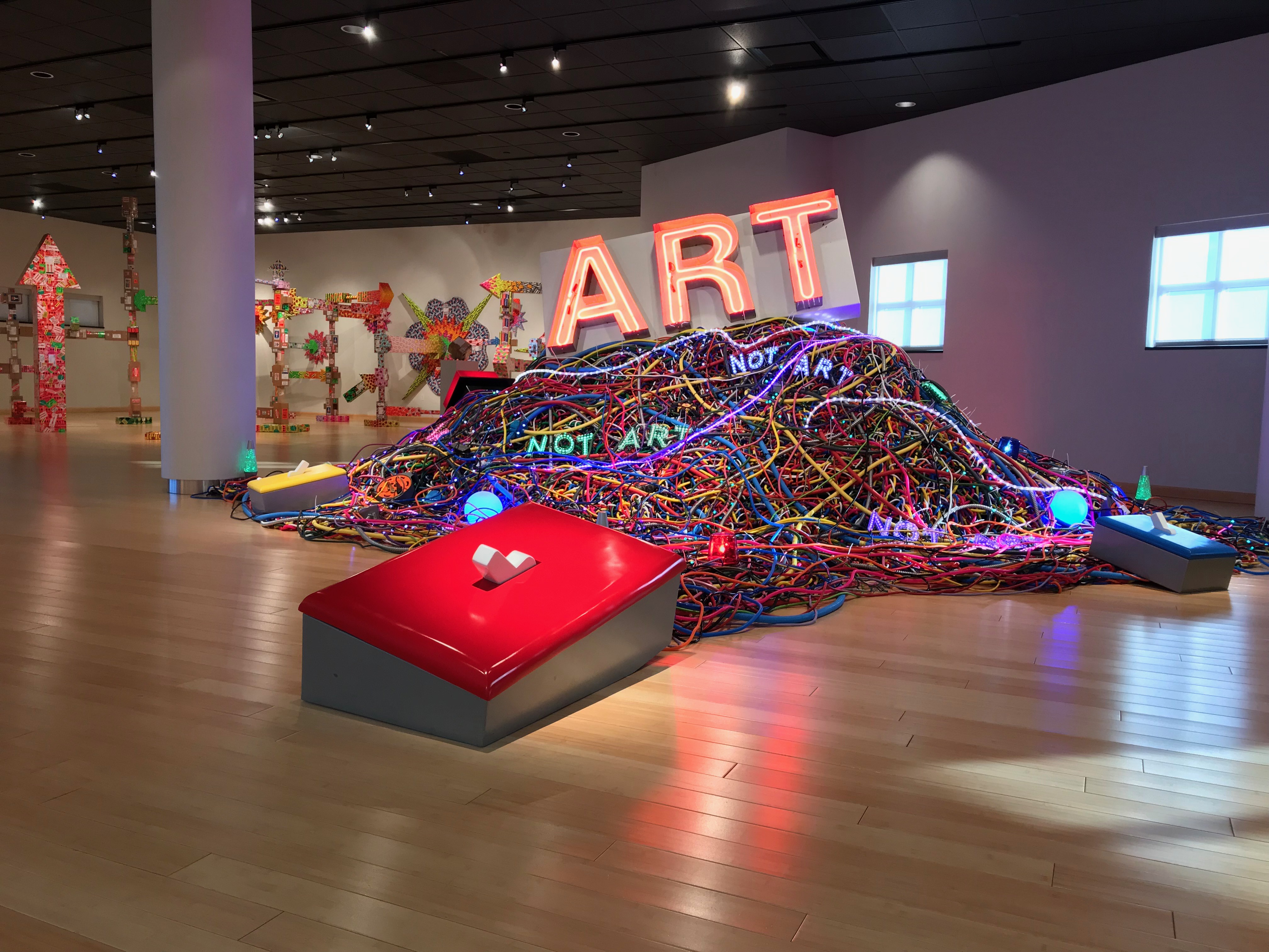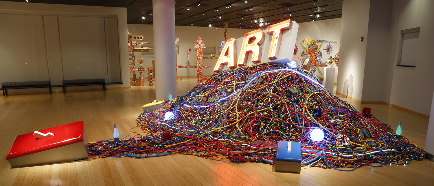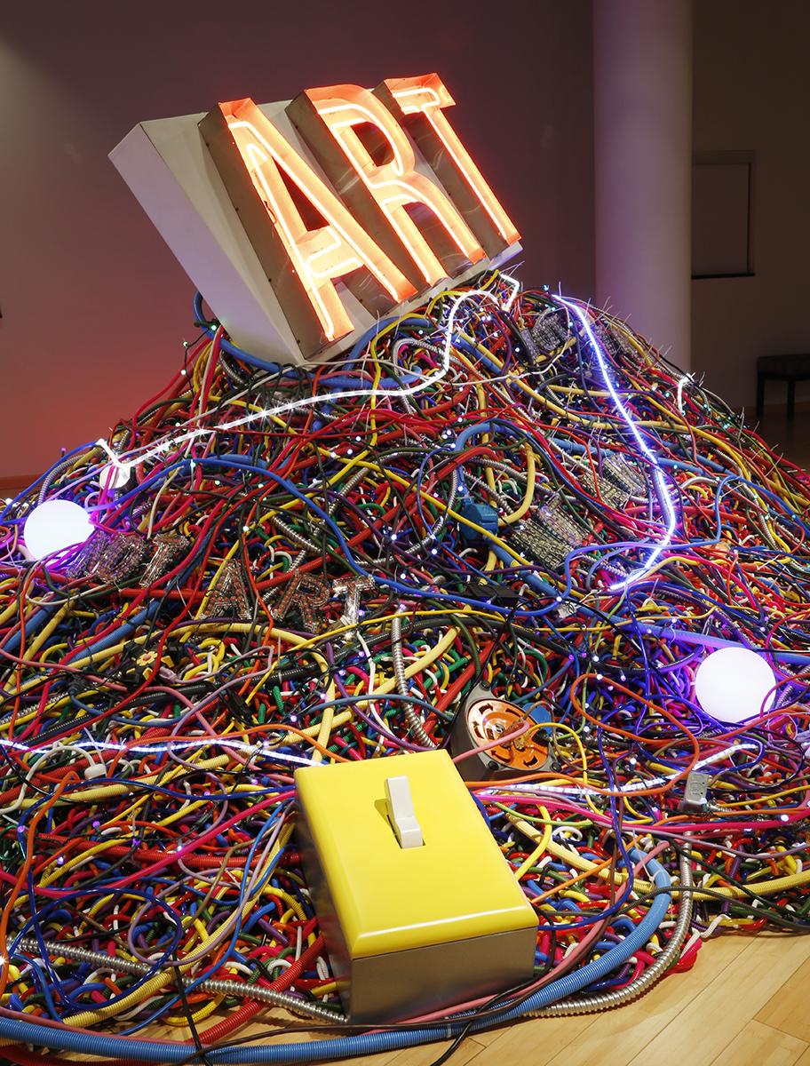 Wall-mounted works exploring the use of laser-cut postage stickers to create imagery include The Old Albany Post Office series, which references nostalgia and replacement of old analog processes with more modern technologies; and Touch, a series based on artist Mierle Laderman Ukeles’ 1979-80 performance entitled Touch Sanitation where she thanked and shook the hands of 8,500 NYC sanitation workers. Ferraro’s Light Switch series includes interactive installations that allow the viewer to make ART, or in some cases, declare the work NOT ART. They happily abound with irony and sarcasm because making art is anything but flipping a switch.