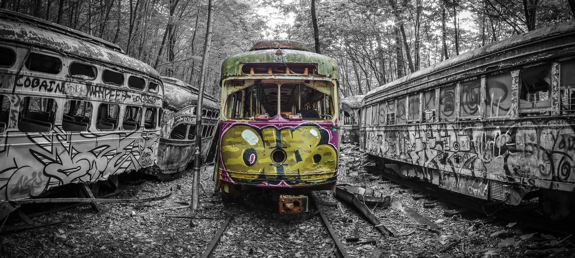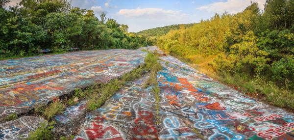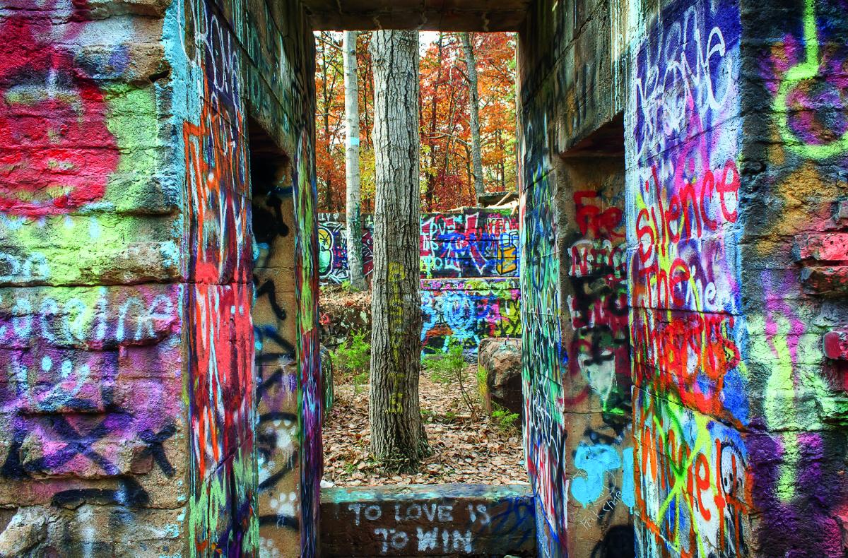 His quest to find landscapes and spaces consumed by graffiti began in Centralia, the Pennsylvania ghost town that sits atop a burning mine fire. The main road leading into town was buckled by the fire underneath, and decades later, people started to leave their mark.