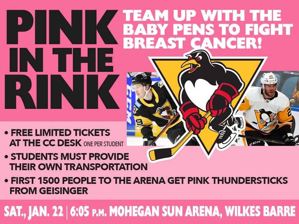 Support breast cancer awareness initiatives and enjoy a hockey game as the Wilkes-Barre Scranton Penguins face off against the Toronto Marlies - students can pick up a free ticket at the CC info desk, but must provide their own transportation.
