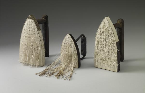 Carol Kunstadt, Pressing On No. 1, No. 5, No. 4, Homage to Hannah More, 2019, antique sad irons, linen thread, paper: pages by Hannah More dated 1791, 7” h x 14” w x 10” d