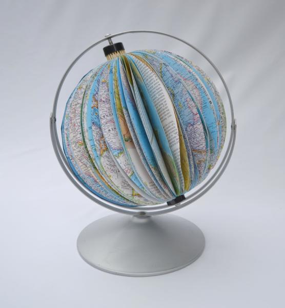 Janet Reynolds, Fragile Planet, 2022, discarded atlas, metal globe frame, 18” h x 13” w x 12” d