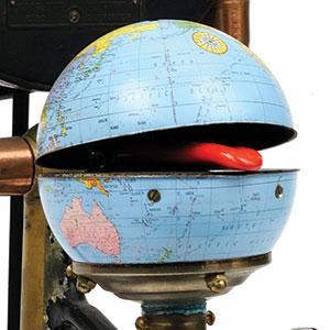 Randall Cleaver combines found and discarded objects to create his sculptures and automata. The found objects themselves become the source of inspiration as the various parts transcend their original use to become a new work of art. Cleaver’s working style is intuitive: he begins with a germ of an idea, and as it grows, different relationships are uncovered and the form of the work responds to these discoveries. He likes viewers to be amused and surprised by the pieces as they discover the various parts, interact with the animation, see the glow of the lights, or hear the clocks activate on the hour.