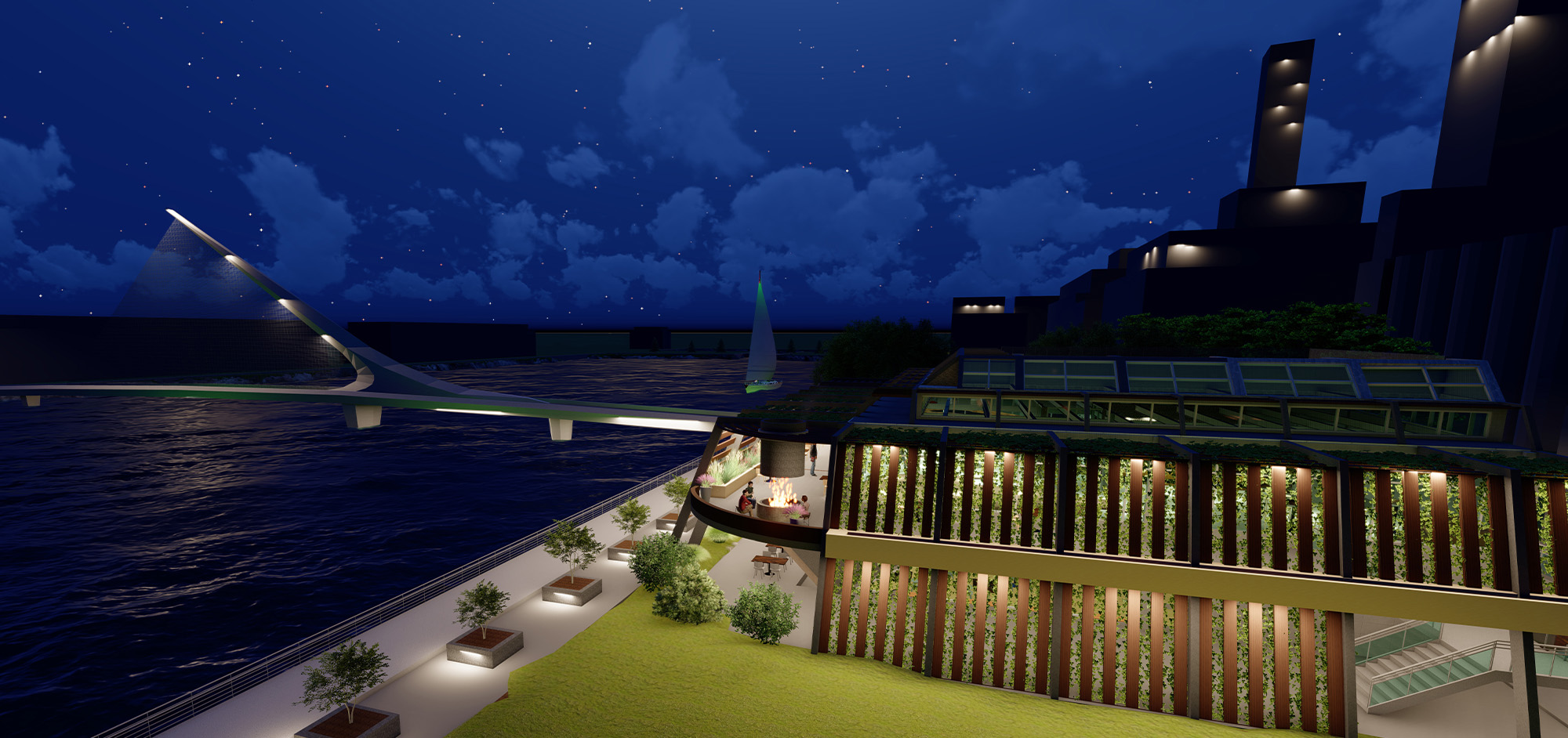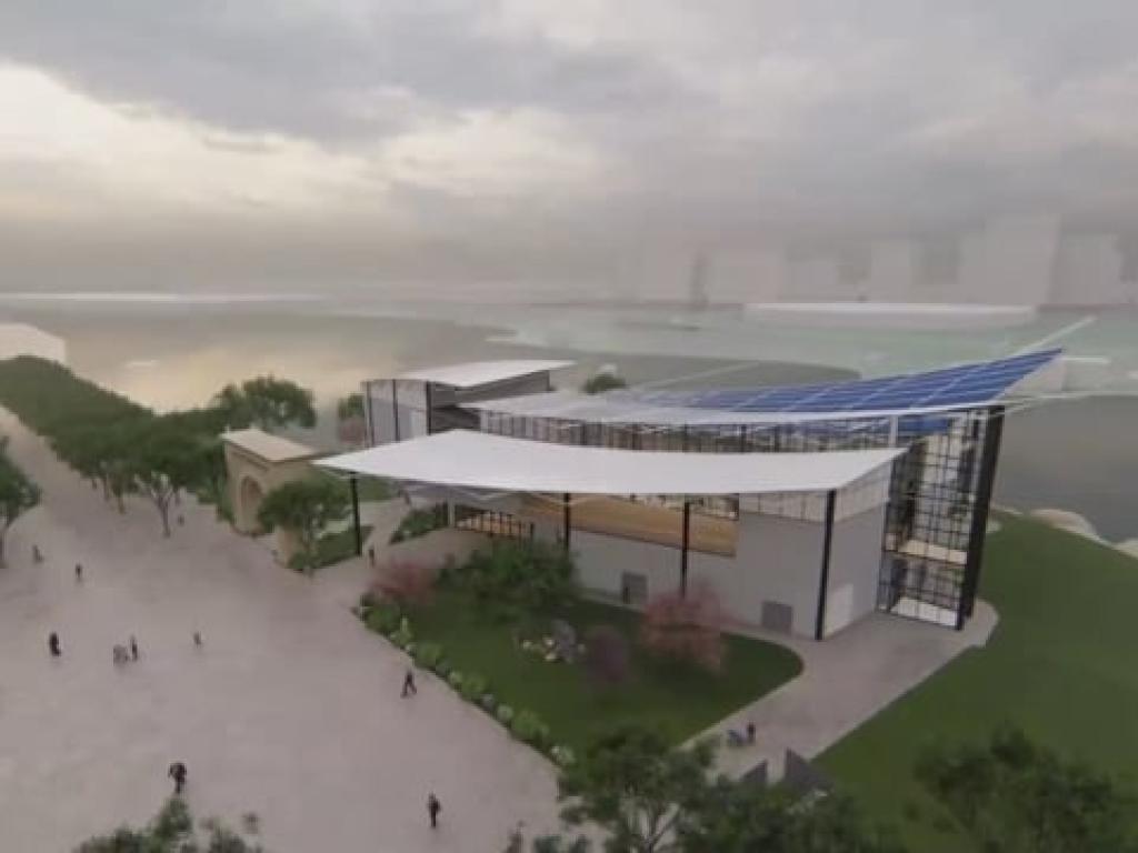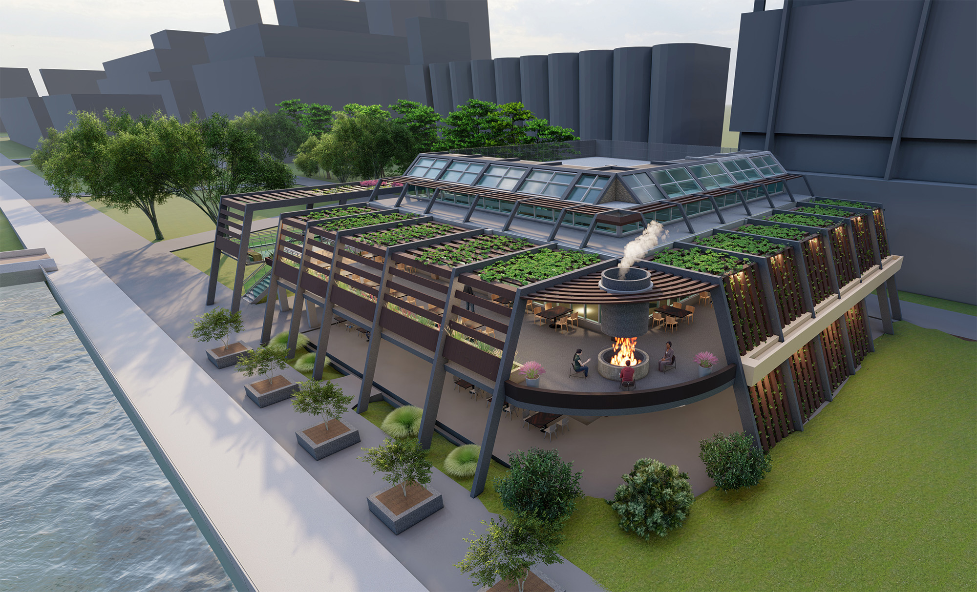 Rendering taken from the Eastern side of the building showing the outdoor auditorium space.