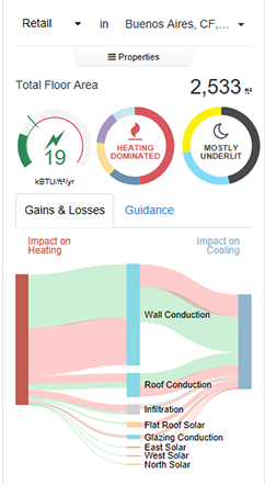 Diagrams taken from the Sefaira program, showing the total floor area, the kBTU’s used per square foot per year, the equipment usage, the overlit, well-lit, and underlit diagram, and the gains and losses through the façade.