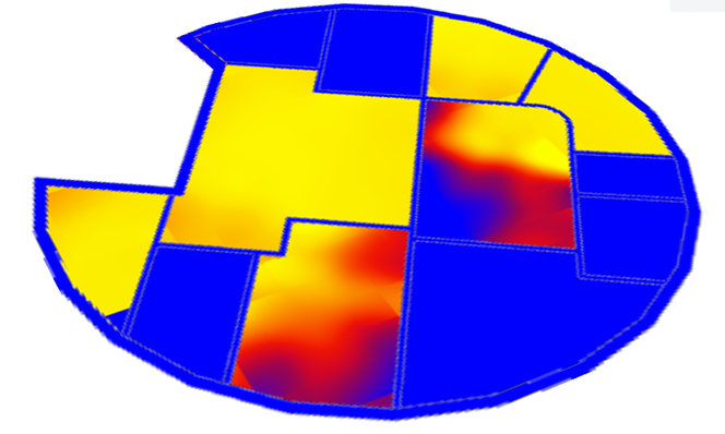 A daylighting diagram from Sefaira which shows whether the building is overlit, well lit, or underlit based on the colors (yellow is overlit, red is well lit, and blue is underlit).