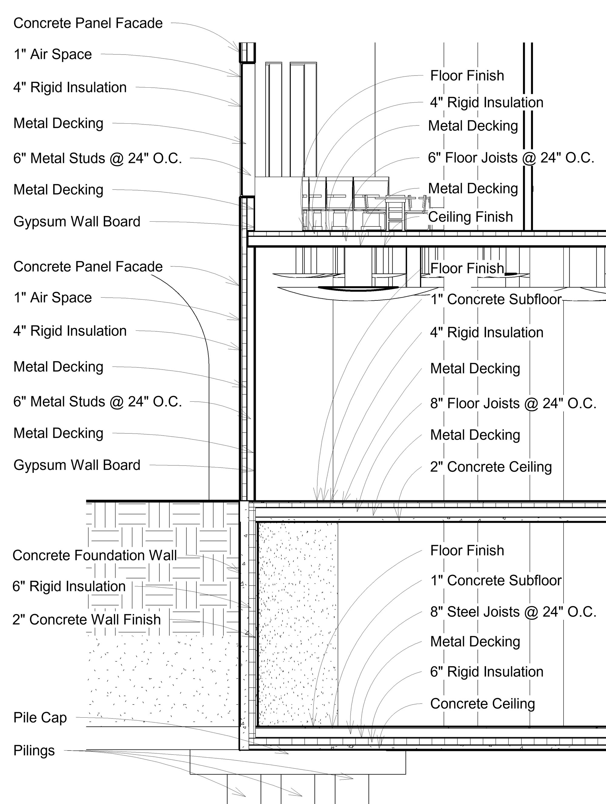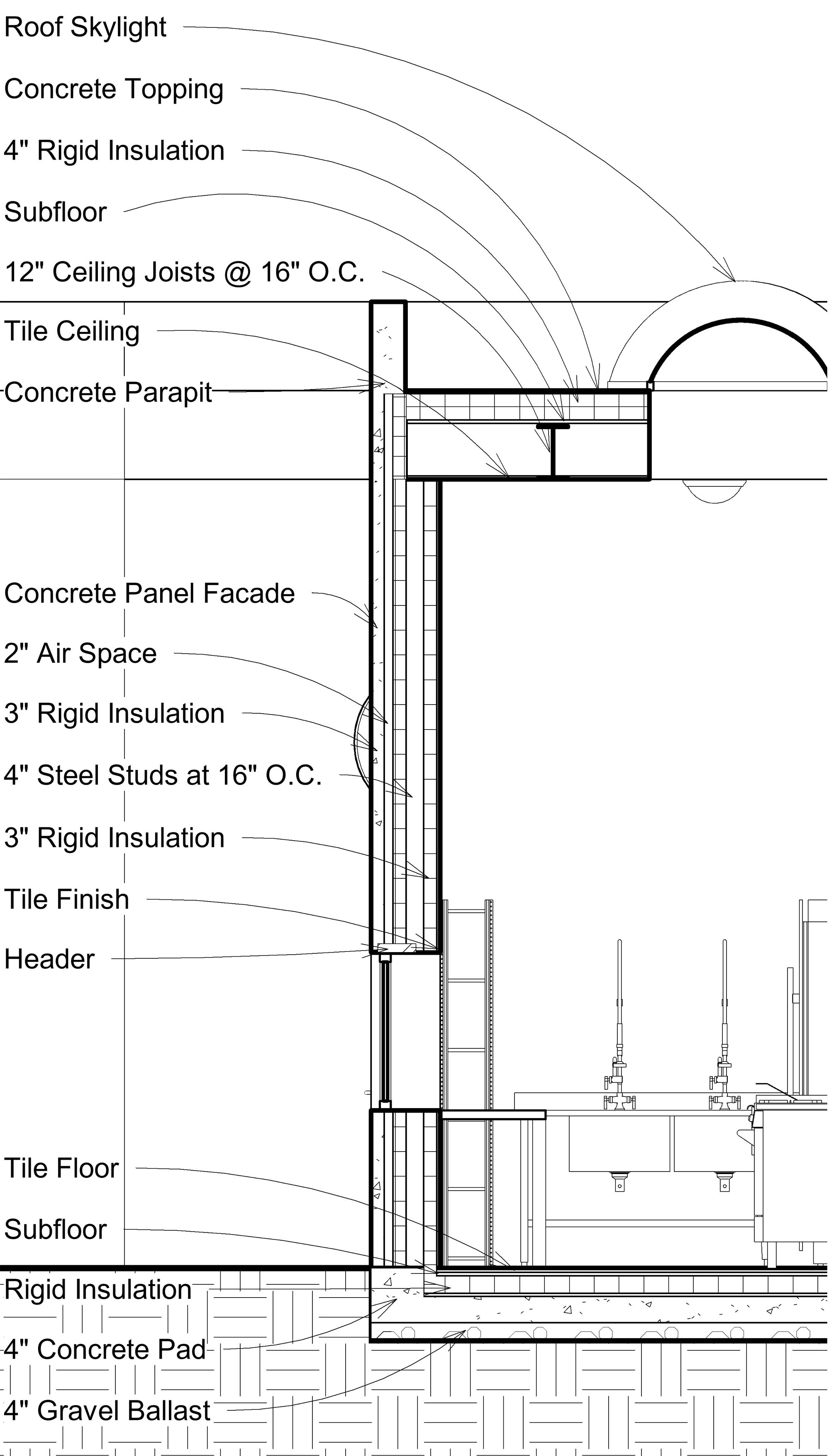 The wall section of the concert hall, showing the foundation, wall, and roof construction.
