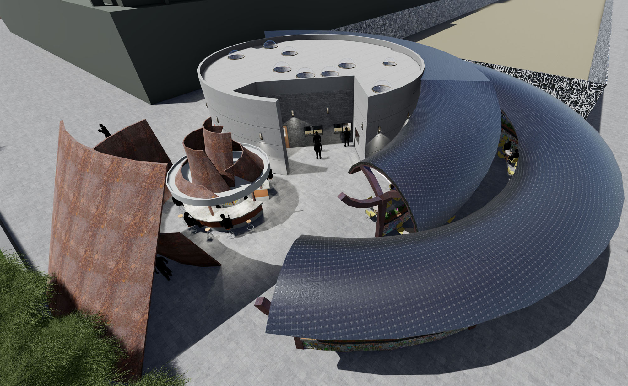 In this rendering, the view is from the park side as if you were approaching the restaurant. This view shows the main restaurant building and the sculptural feature which is hiding the bar.