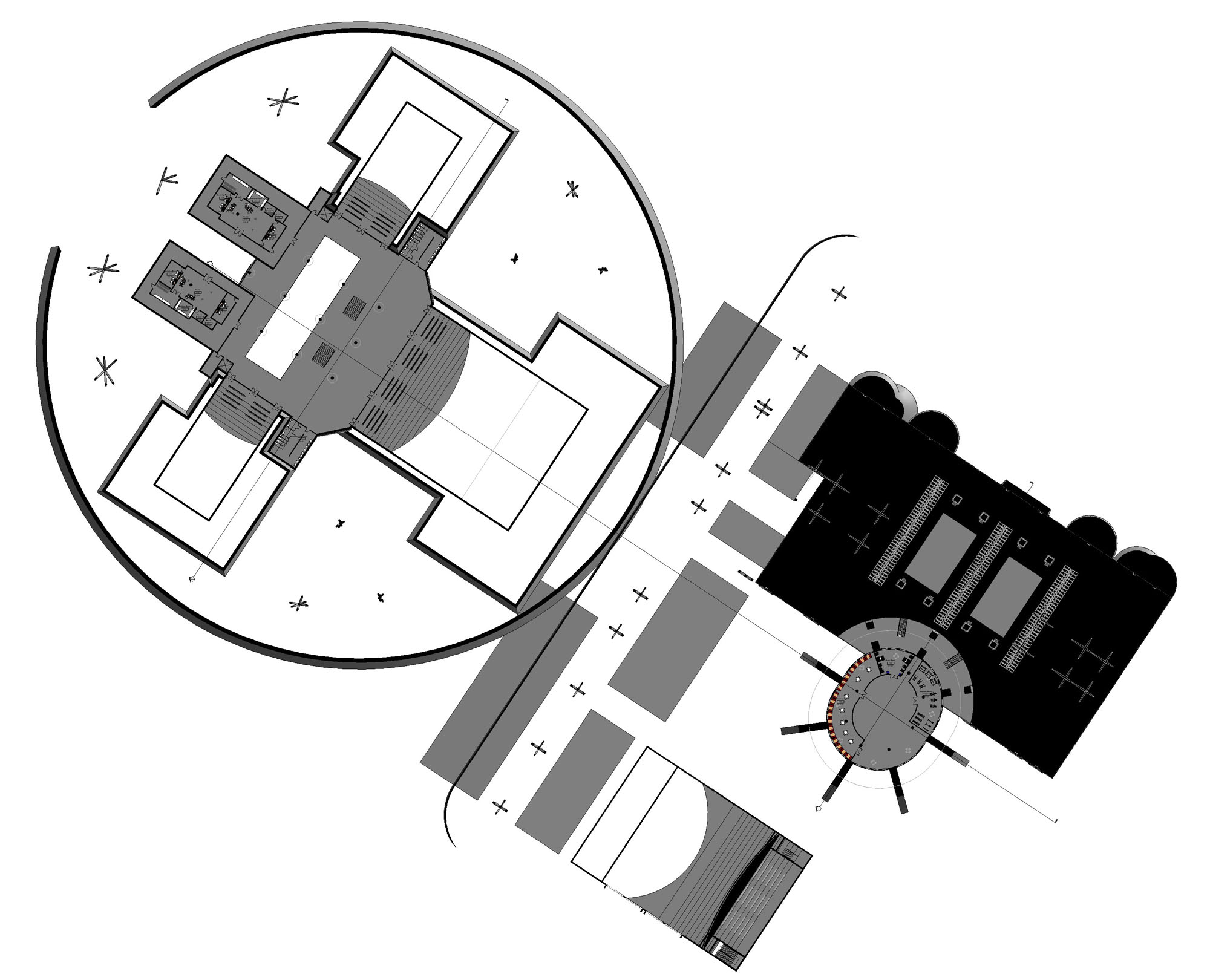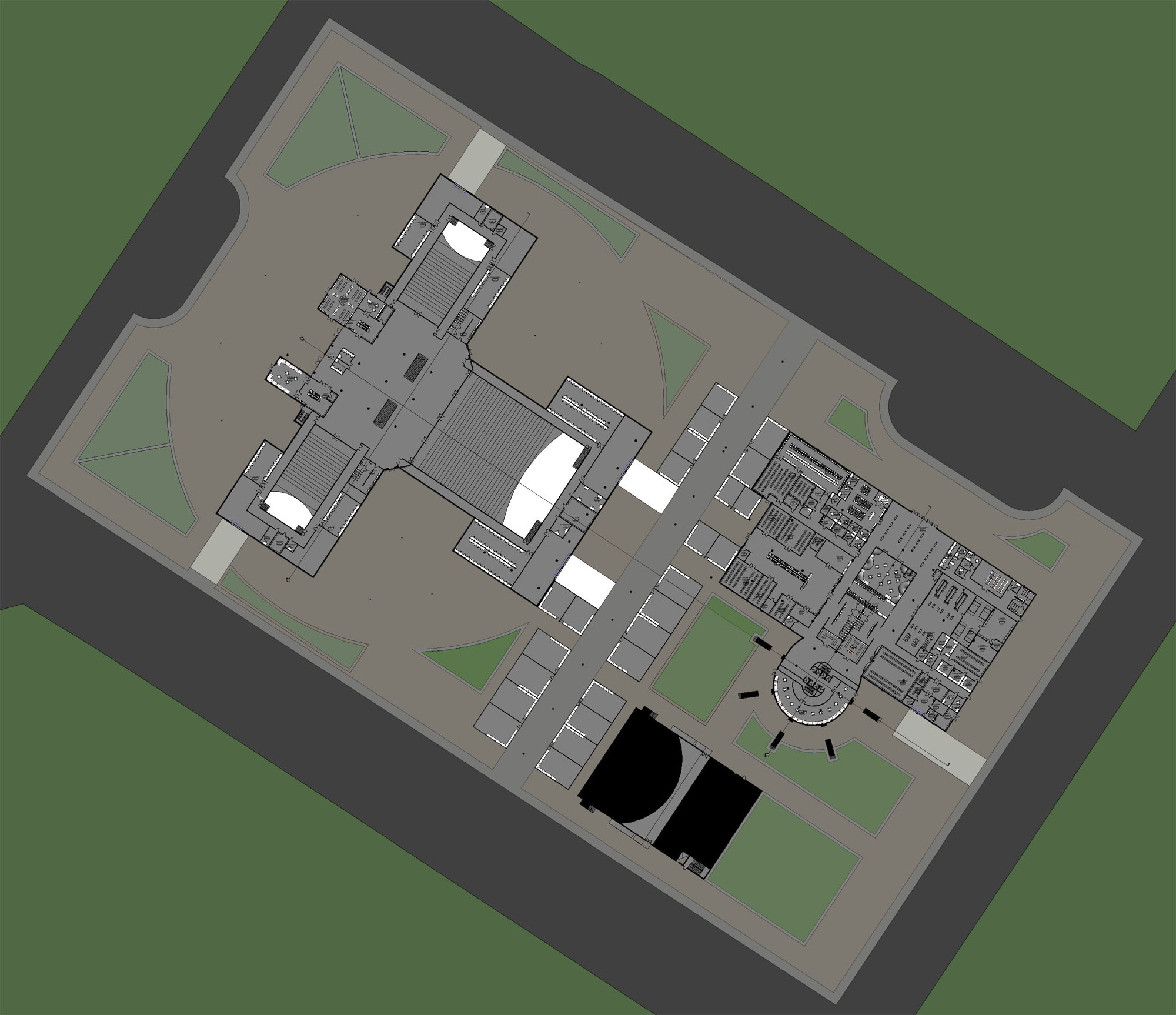 The ground floor plan of both buildings, showing the room layouts and the spaces of the buildings, this plan contains most of the mandatory spaces for the resort, the three auditoriums in the concert hall, the market thoroughfare in-between both buildings, and the outdoor auditorium at the bottom.
