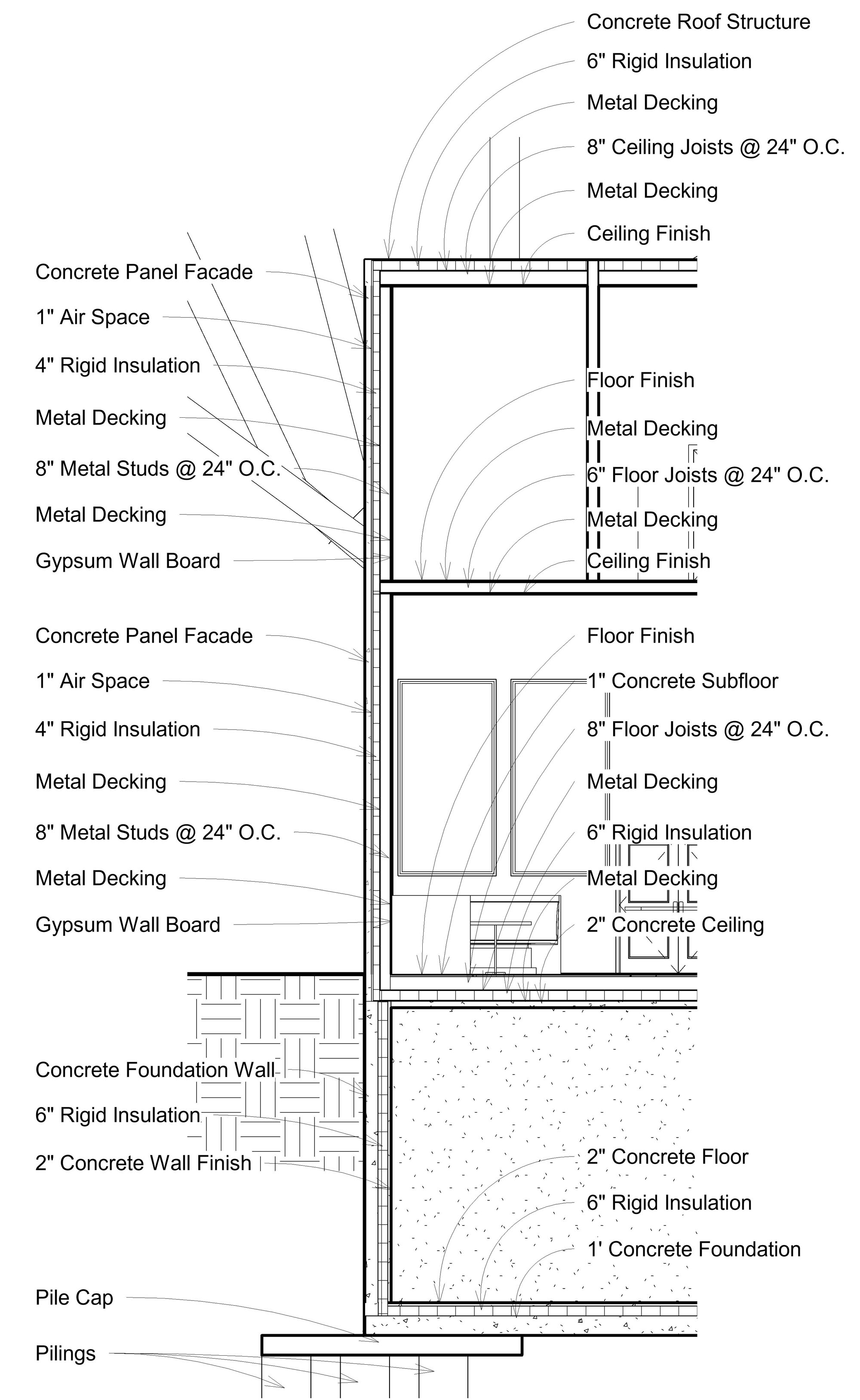 A wall section of the building, showing the foundation, wall, and roof construction.