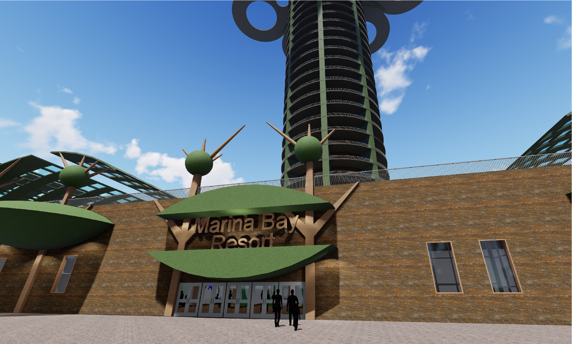 A rendering of the resort’s entrance, showcasing the floral designs I used in the building and tower.
