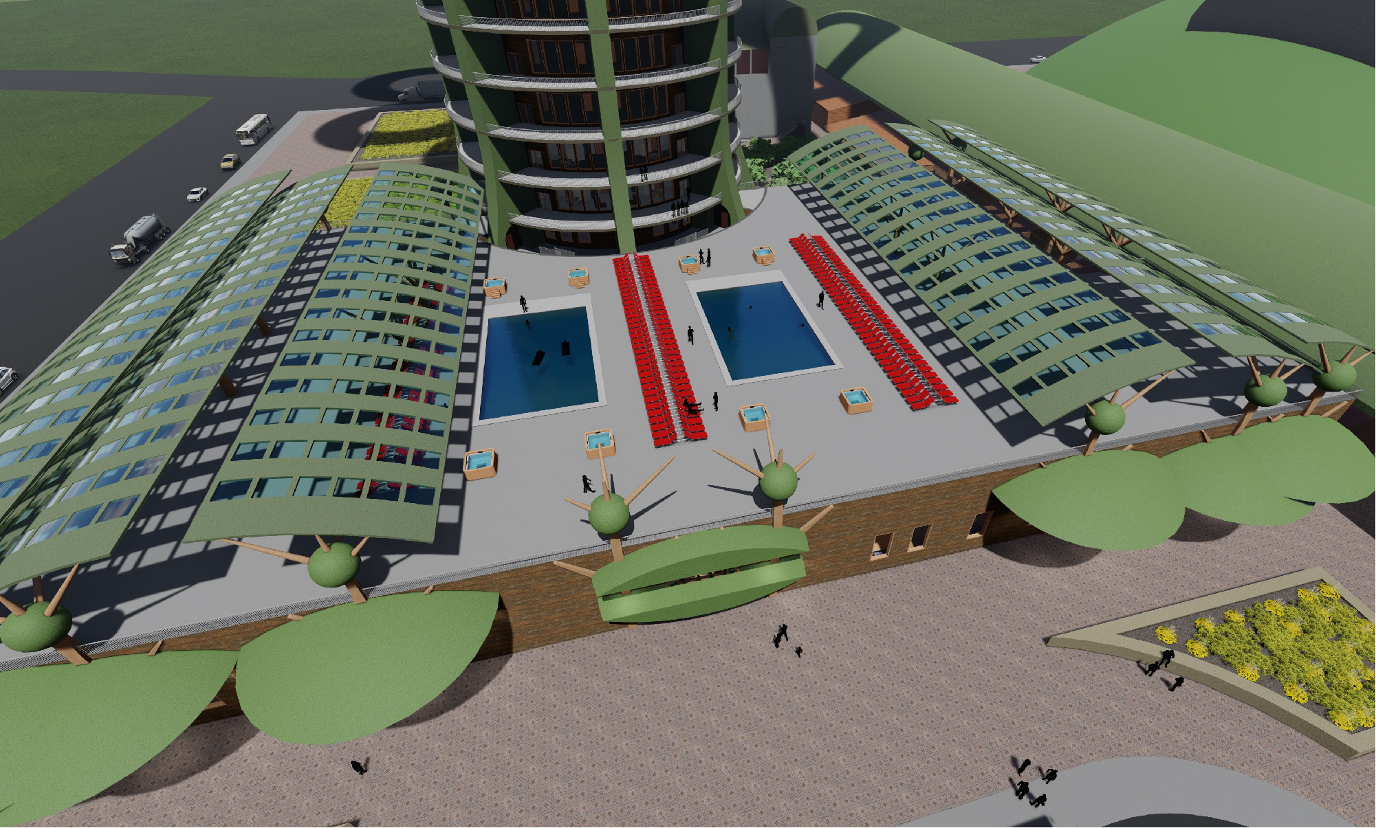 In this birds-eye view rendering, the view showcases the pool, the entrance to the building, and part of the thoroughfare’s roof.