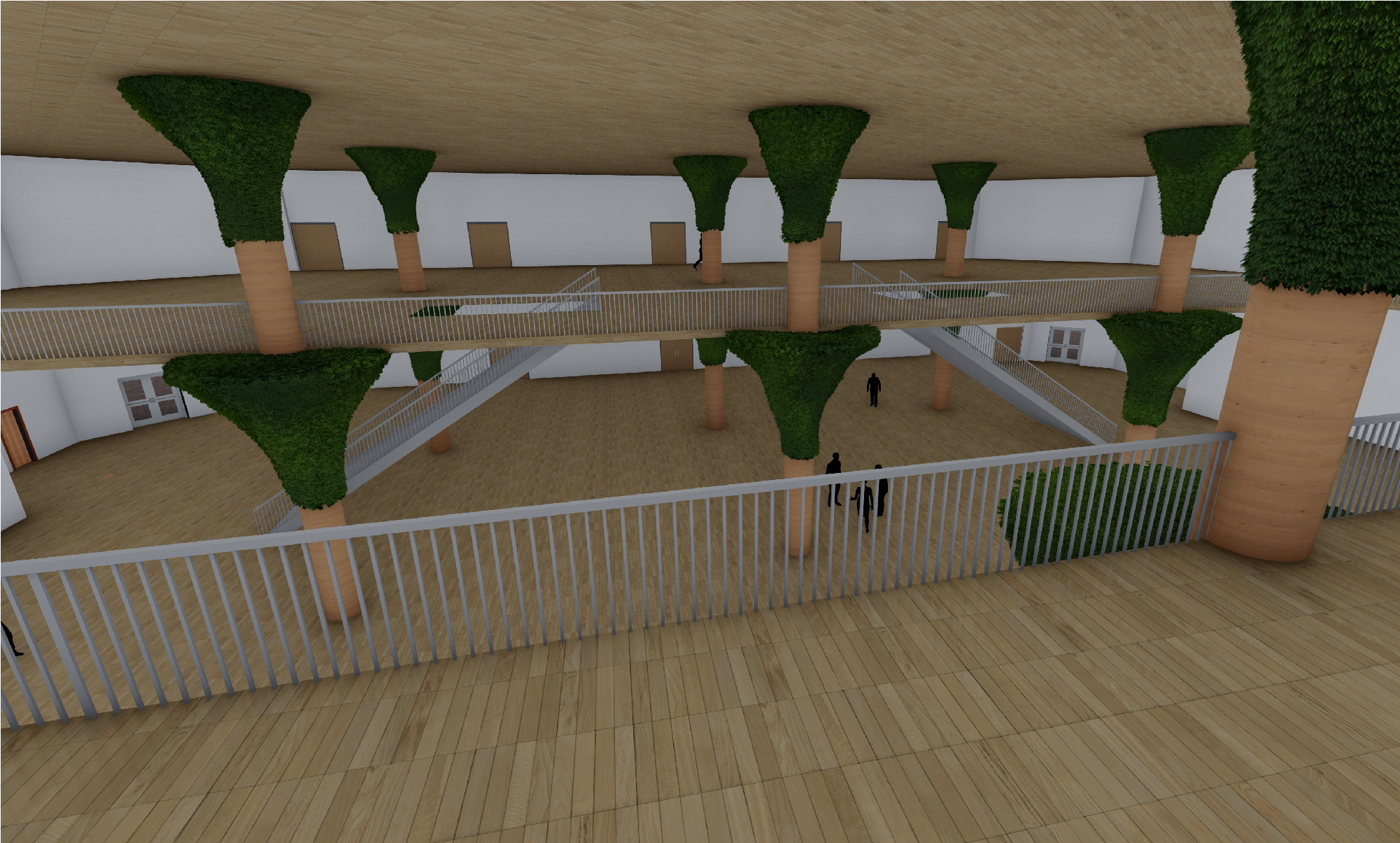 In this rendering, the view is of the main hall of the concert hall showcasing more floral inspirations in the columns and supports for the dome outside, which was intended to resemble the canopy of a forest.