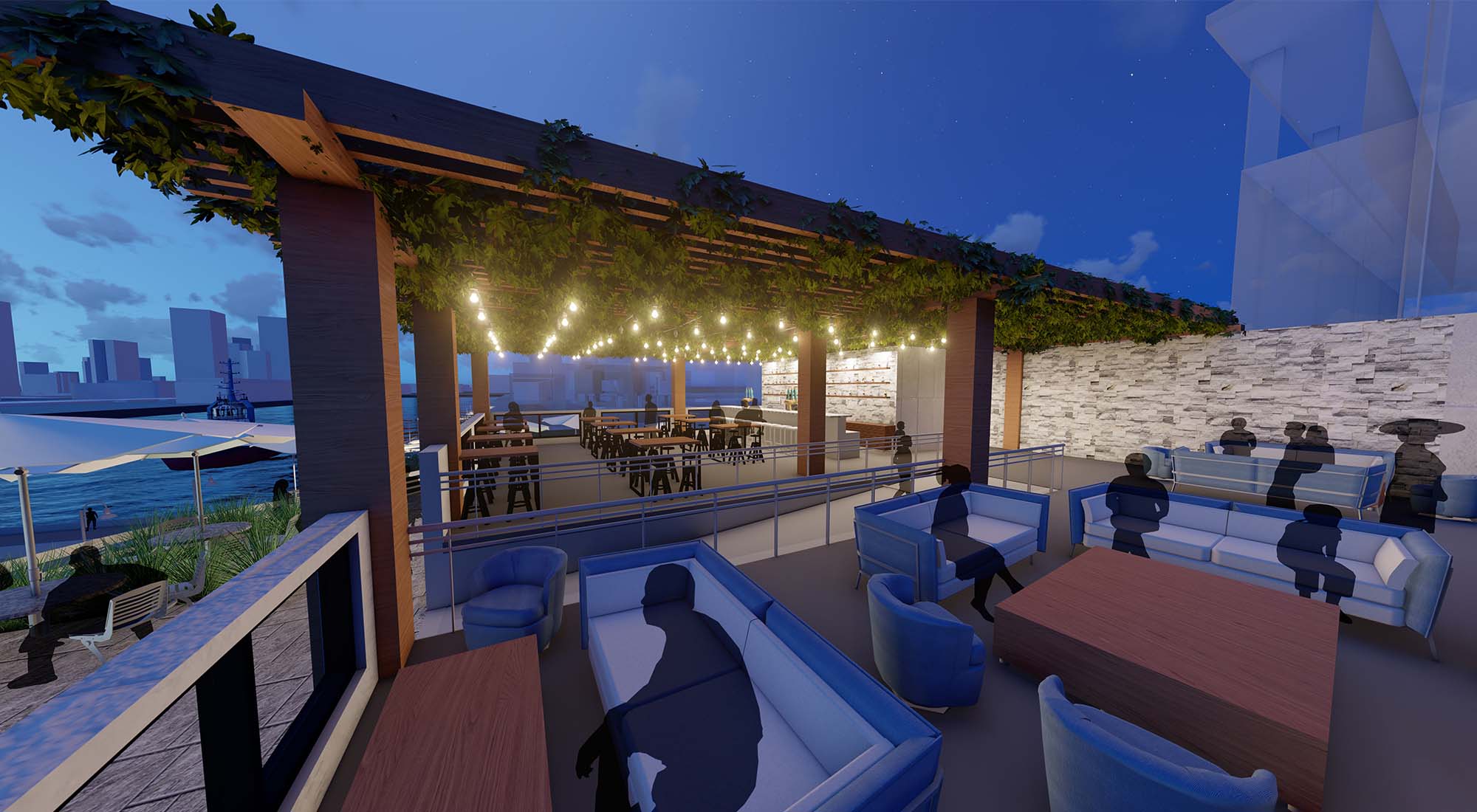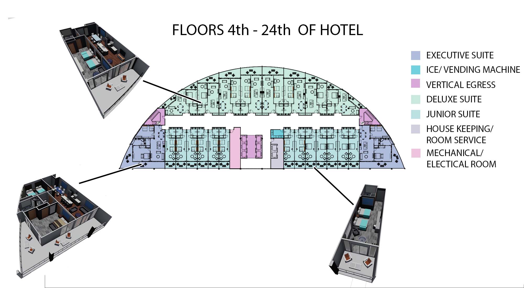 Floor plan and rendering of fourth floor highlighting the guest rooms.