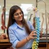 Student examining a model of the human spine in an anatomy lab.