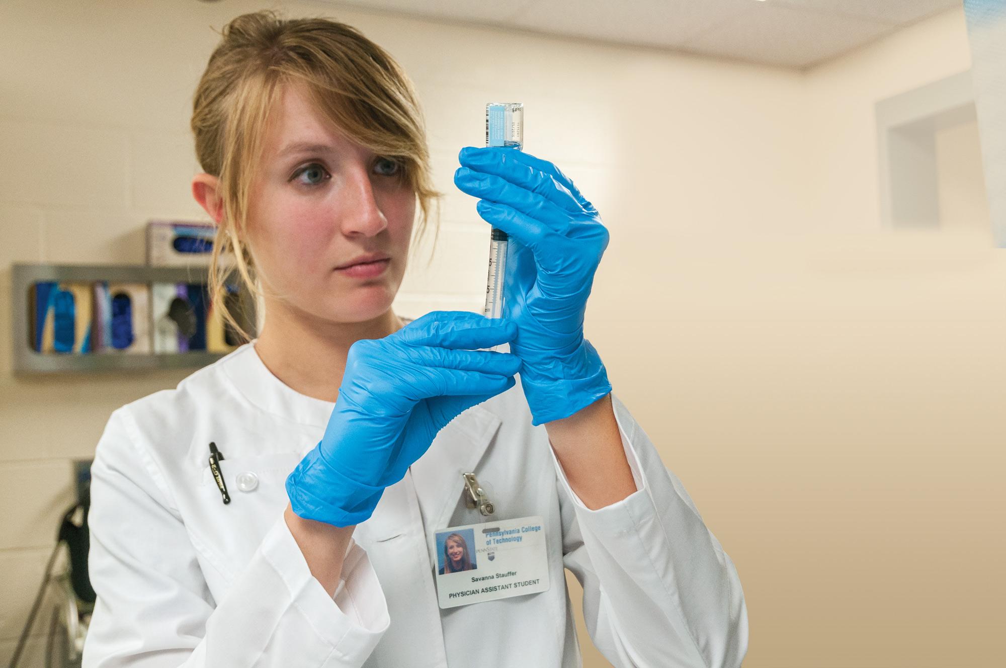 During a flu shot clinic on campus, physician assistant student Savanna R. Stauffer, ’17, draws a dose of the vaccine into a syringe.
