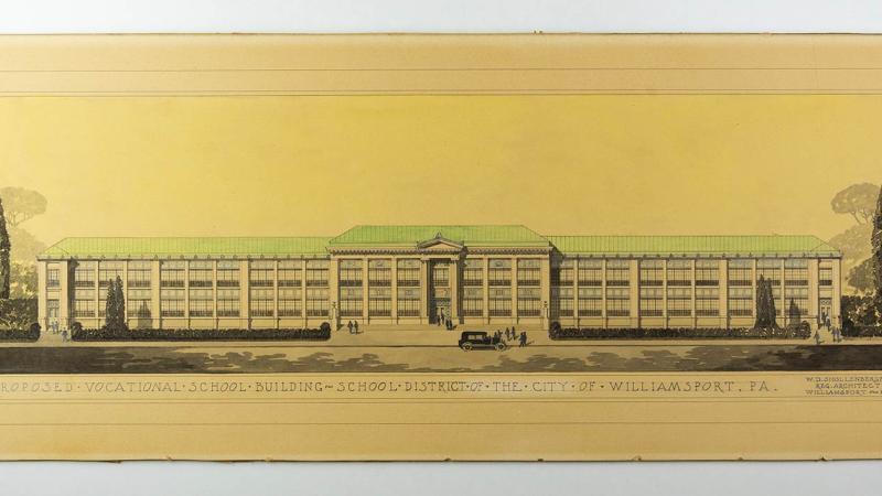 The archives includes a rendering for a “Proposed Vocational School Building” for the Williamsport School District. The rendering is credited to W.D. Shollenberger, registered architect, of the city, who left a clue to its era in the style of the vehicle he illustrated. The drawing was provided to the archives by late administrator William Homisak.