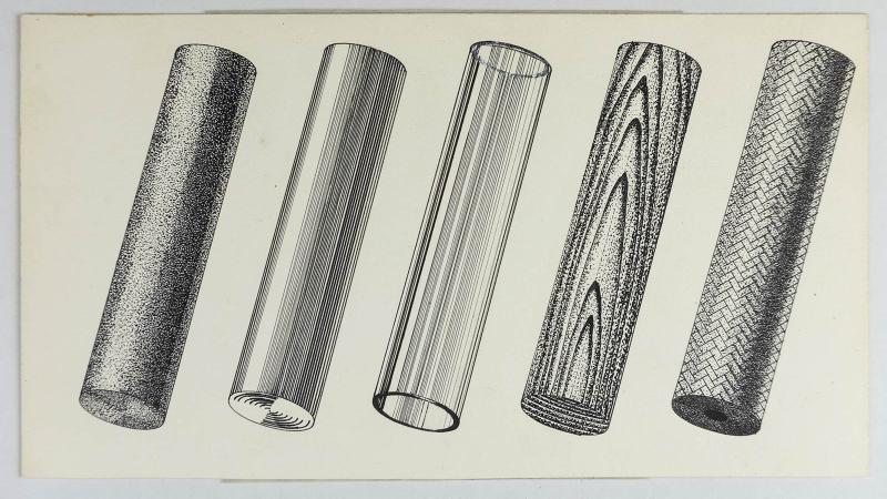 Hand-drawn technical illustrations include a massive steam boiler brought down to size in a student’s meticulous ink work. The pieces were donated to the archives by retiree Patrick Murphy, an associate professor of advertising art who received Master Teacher honors in 1989. The work of technical illustrators was used in service manuals, textbooks and parts catalogs.