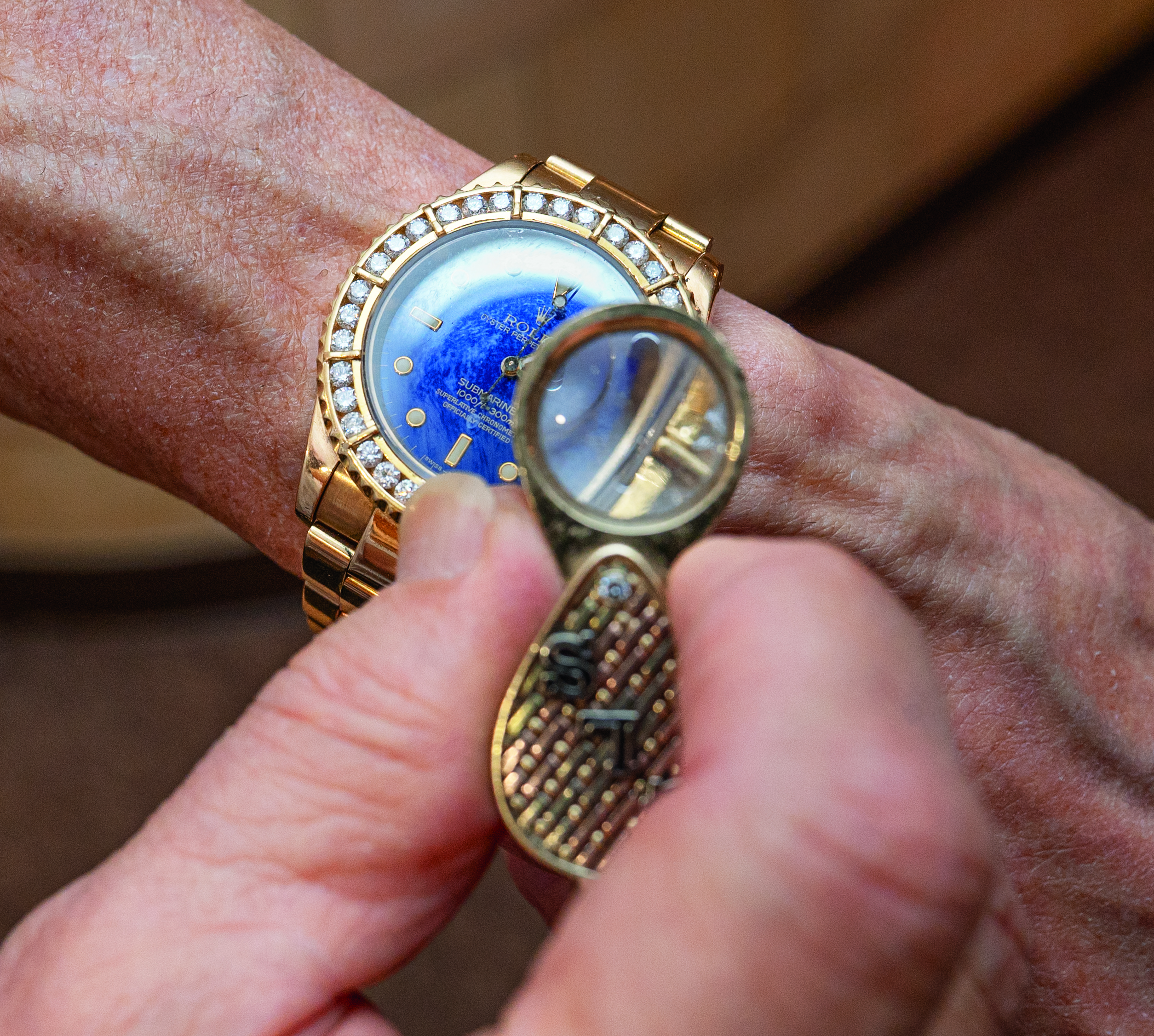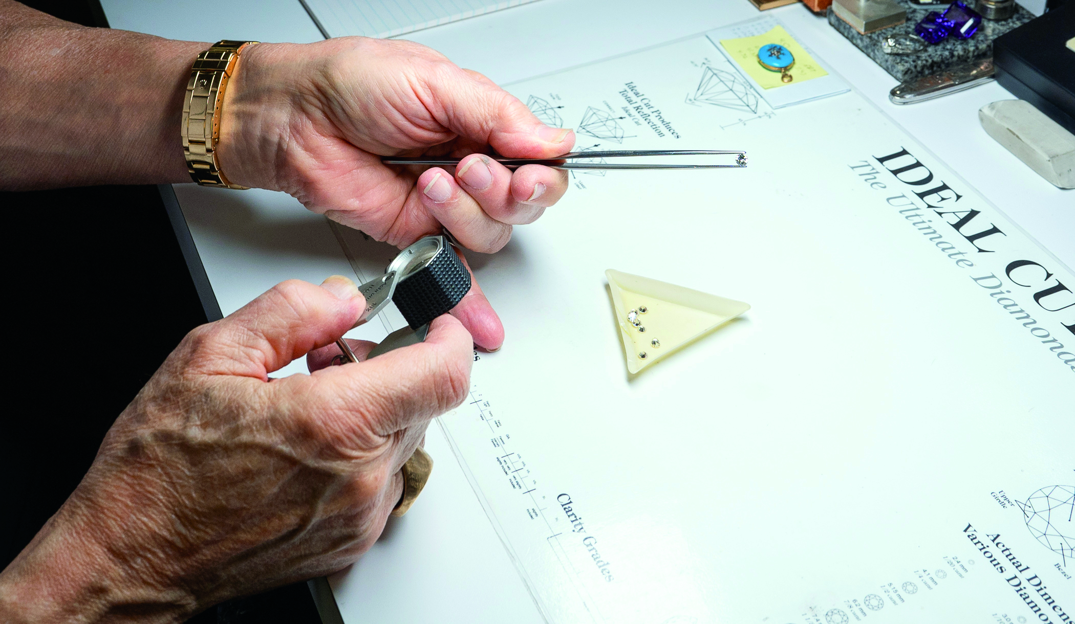 A digital microscope that projects onto a huge flat-screen monitor allows Smith to pinpoint details to the hundredth of a millimeter on any stone. Another tool he employs is a toaster-size instrument called a PhosView, which shines an ultraviolet light to help distinguish between natural and lab-grown diamonds. If the diamond fluoresces a greenish color, it’s a less valuable lab-grown version. Of course, Smith’s 4-carat diamond ring glows a bit blue, not green.