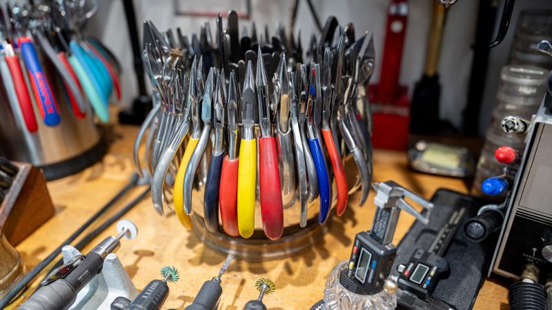Behind him is an anvil with an elongated and sharp snout modeled after illustrations of the one belonging to Benvenuto Cellini, a renowned Italian goldsmith during the Renaissance. Nearby are watchmaker lathes and an electric casting machine. And the 150-plus pliers Smith has made or modified for diamond setting are impossible to ignore.