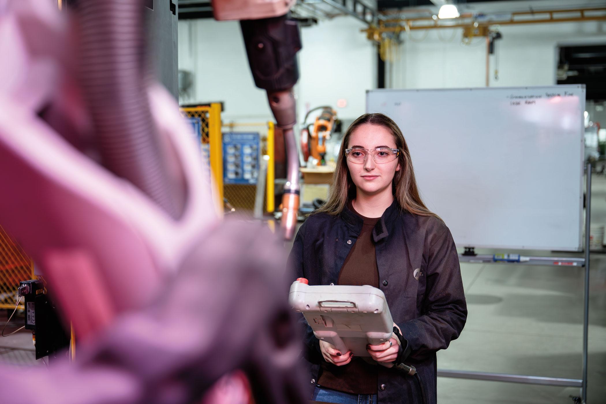 Natalie A. Greiner operates a Motoman robotic welding cell in Penn College’s Lycoming Engines Metal Trades Center. She completed an internship with auto parts maker Autokiniton in Michigan.