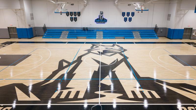 The renovation, which began in March and was completed in October, included removing the original gym floor, re-leveling the subfloor, removing the bleachers and painting the original brick walls. The new floor is highlighted by a court-filling Wildcat logo, while the blue and gray bleachers offer a touch of color to accent the newly painted gray walls. The annexes on both ends of the court feature a large mural of the cropped Wildcat logo that matches the design of the exterior mural on the building’s Third Street entrance.