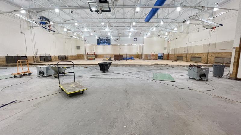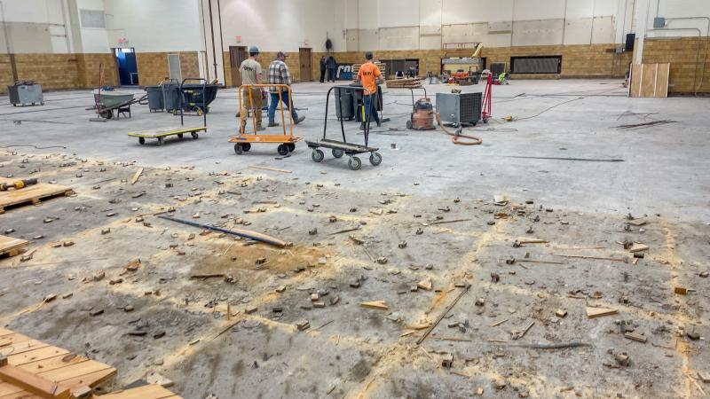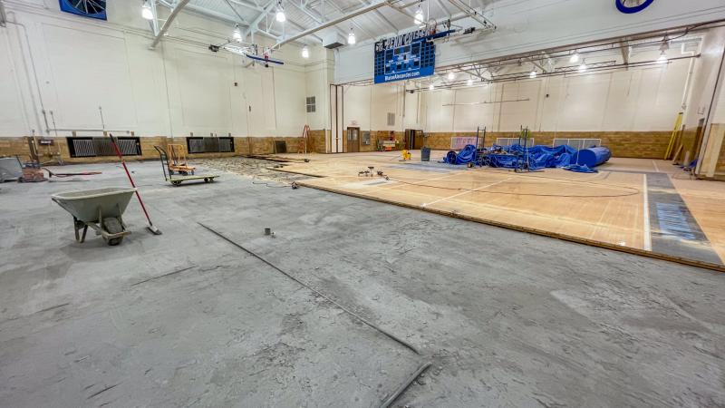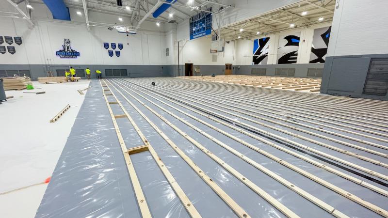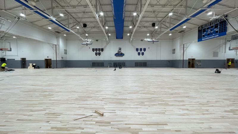 The recently replaced gym floor in the Lewis H. Bardo Gymnasium